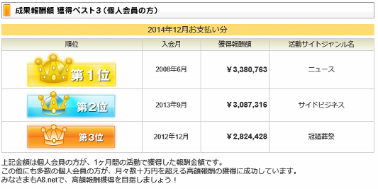 ブログにA8.netのバナーを貼って稼ぐ ネット稼ぎ【おススメ度★★★★★】 2015年01月05日 0 【A8.net】おススメ度★★★★★ A8.netは自分で売れると思ったサービスや物の広告を選択して、 ブログなどでその広告を紹介し、クリックや購入してもらって稼ぐサイトです。 アフィリエイトの王道的なサイトなので、初めての方におススメします(^^♪ <A8.netの特徴> (1)アフィリエイトサイト数、広告主数ともに日本最大級なので、 紹介できる物やサービスの選択肢が多い。 高額報酬の選択肢も多い。 (2)自分で商品購入やサービス申込みすることで報酬が貰える 自己アフィリエイトが可能な商品やサービスがあり、 普通に購入するよりも断然お得になる。 (3)AS会員募集プログラムがあり、A8.netを紹介して登録して頂けると、 AS会員登録1件につき500円の成果報酬を受け取ることができます。 (4)サイトやブログを持っていない方でも登録できるので、 誰でも簡単にアフィリエイトを始めることができます。 (5)定期的にキャンペーンやイベント、セミナーが開催されており、 期間限定の高額報酬案件やアフィリエイトを勉強できる機会があります。 特徴説明でちょっと文字数が多すぎで、読みずらいですよね(笑) かなり大手なので安心してアフィリエイトを始められます。 気に入った商品やサービスを紹介して購入や申込みが入ると稼げます。 自分が知っている物や気に入っているサービス等は紹介にも力がはいると思います。 上記画像は2015年1月現在の個人会員の方が1か月で獲得した金額です! こんなに稼げたら言うことないですよね(^^♪ アフィリエイトの第一歩におススメです(^^♪ ▲A8.netの登録用バナーです。興味のある方はここからスタート▲ <A8.netで収入を上げる方法> ※ご参考です A8.netのサイト内で詳しく説明してくれていますので、まずサイトに登録して 下記画像のページを一つずつ確認していくことをおススメします♪ 私が一つずつ記事に書いて説明するよりも、絶対にわかりやすいですし…(笑) 非常にわかりやすく説明してくれてます。A8.netでの稼ぎ方といより 全てのアフィリエイトをするにあたって参考になる情報ですね♪ でも一番成果を出すにはまず『継続』ですよ! 成果が出なくてくじけそうになるかもしれませんが、我慢我慢( `ー´)ノ <A8.netでの注意点> (1)自分のブログに貼った広告へ自らクリックしないこと。 (2)広告へクリック誘導しないこと。 『クリックお願いします』とか書かない (3)紹介文で誇大広告にならないように注意すること。 『絶対』とか『10分で100万稼げる』とか極端な表現 上記3点をやってしまうと強制退会を受ける可能性を高めます。 <A8.net運営会社概要> (株)ファンコミュニケーションズが運営しています。 資本金10億9060万(平成26年9月30日現在)の大きな会社が運営しています。 ▼A8.netに興味がある方はこちらからスタート▼ ▼A8.netとは?を動画で見たい人へのご参考です♪ [2回]