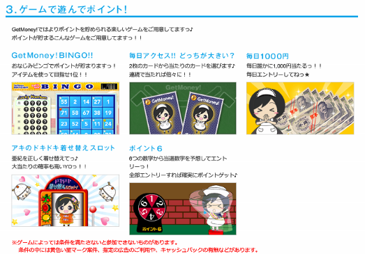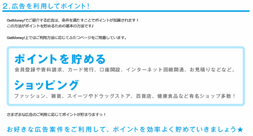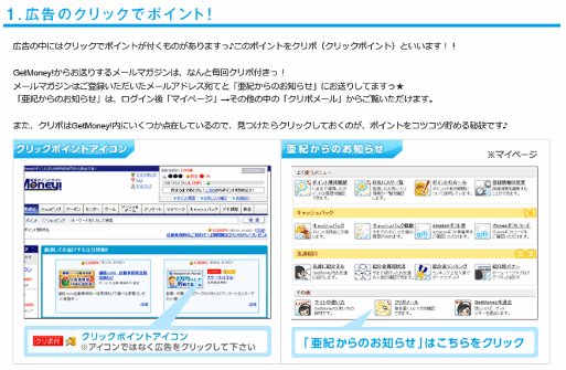 ポイントサイトGetMoney!で稼ぐ ネット稼ぎ【おススメ度★★★★★】 2015年01月07日 0 【GetMoney!】おススメ度★★★★★ GetMoney!は物やサービスに申し込んだり、ゲームや広告クリック等して、 ポイントを集め、それを換金して稼ぐポイントサイトです。 サイトへ登録してもらうと、紹介者が稼いだ50%が還元されるすごいサイトです。 紹介者を増やすことが一番稼げる方法です!(^^♪ <GetMoney!の特徴> (1)紹介による登録で、紹介者が稼いだ50%が還元されます。 紹介者1人からでも50%還元が適用されるポイントサイトはなかなか無い。 紹介者ランキングもあって、紹介すればするほど稼げます。 (2)毎日のように届く、メルマガにクリックポイントがあるので、 それをコツコツとクリックする事で稼げます。 (3)家族4人まで登録できます。 (4)ゲームや楽しめるコンテンツが充実しています。 (5)500円(5,000ポイント)から換金が可能です。 換金手数料も無料です。 ポイントサイトの中では歴史が古く、げん玉やモッピーといった人気サイトと ライバルと顧客獲得を争っている状況だと思います。 総額18億円以上、延べ80万人(2011年4月現在)がお小遣いをGETしている 状況を考えると安心して始められるサイトです。 ポイントサイトをやるなら、おススメです(^^♪ ▲GetMoney!の登録用バナーです。興味のある方はここからスタート▲ <GetMoney!の収入を上げる方法> (1)紹介者還元50%が一番稼げます。 ブログなどで紹介して紹介者数を増やしましょう。 (2)毎日のように届く、メルマガのクリックポイントを獲得しましょう。 (3)サイト内広告でクリックポイントのあるものはクリックしましょう。 (4)☆マークが付いている物やサービスを申し込んだ際に専用ゲームが できるようになるので、忘れないようにゲームを楽しむこと。 ポイントサイトでもやはり『継続』が大事です。 1回1回の単価は安くても、耐えながら継続する。そして紹介者を獲得する。 これがポイントサイトで稼ぐコツだと思います。 <GetMoney!での注意点> ポイントサイトでは特に注意する事はないように思います。 虚偽申告や法律に触れる行為等、基本的に駄目な事だけはやめましょう。 <GetMoney!のご参考情報> <GetMoney!運営会社概要> インフォニア(株)が運営しています。 資本金2億1150万(平成26年4月1日現在)あるきちんとした会社です。 老舗懸賞サイトのチャンスイットも運営しています。 ▼GetMoney!に興味のある方はこちらからスタート▼ [3回]