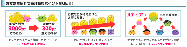 ポイントサイトげん玉で稼ぐ ネット稼ぎ【おススメ度★★★★★】 2015年01月09日 0 【げん玉】おススメ度★★★★★ げん玉は物やサービスに申し込んだり、ゲームや広告クリック等して、 ポイントを集め、それを換金して稼ぐポイントサイトです。 記事を書いたり、簡単なPC作業をして稼ぐコンテンツも充実してます。 サイトへ登録してもらうと、紹介者分と紹介者が紹介した方の分まで還元されます! サイト紹介は3ティア制となっており、紹介者を増やすことが一番稼げる方法です!(^^♪ <げん玉の特徴> (1)紹介者を増やせば増やすほど、紹介者が稼いだ還元率が上がっていきます。 紹介者制度は3ティア制(自分⇒紹介者⇒紹介者まで還元)で紹介すればするほど 稼げるサイトです。これがげん玉の人気を上げている一つの要因です。 (2)毎日のように届く、メルマガにクリックポイントやアンケートがあるので、 それをコツコツとクリックする事で稼げます。 (3)ゲームや楽しめるコンテンツが充実しています。 (4)タイピング工場、モリジョブ、クラウドといった作業仕事も充実しています。 (5)300円(3,000ポイント)からPointExchangeへ換金可能です。 交換手数料が月1回無料になります。 げん玉は人気のあるサイトです。それは紹介制度の充実にあります。 総額30億円以上のポイント交換実績と370万人以上の会員数を誇る 安心して始められるサイトです。 ポイントサイトをやるならおススメです(^^♪ ▲げん玉の登録用バナーです。興味のある方はここからスタート▲ <げん玉の収入を上げる方法> (1)紹介者制度が3ティア制なので、一番稼げます。 ブログなどで紹介して紹介者数を増やしましょう。 (2)毎日のように届くメルマガのクリックポイントを獲得しましょう。 (3)サイト内広告でクリックポイントのあるものはクリックしましょう。 ポイントの森は欠かさずやりましょう。 (4)モリガチャ、モリモリ選手権(ゲーム)も欠かさずやりましょう。 ポイントサイトは『継続』が大事です。 普通に通販を活用するのではなく、ポイントサイトと提携していれば、 メリットが多いので、ポイントサイト経由でショッピングや申込みをしましょう。 これがポイントサイトで稼ぐコツだと思います。 <げん玉での注意点> ポイントサイトでは特に注意する事はないように思います。 虚偽申告や法律に触れる行為等、基本的に駄目な事だけはやめましょう。 <げん玉のご参考情報> <げん玉の運営会社> (株)リアルワールドが運営しています。 資本金4億1116万(平成27年1月現在)もあるきちんとした会社です。 ライフマイルもサイバーエージェントから事業譲受しています。 ▼げん玉に興味のある方はこちらからスタート▼ [4回]