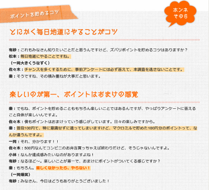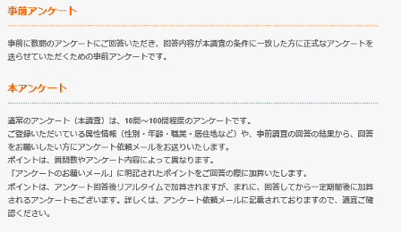 アンケートサイト マクロミルでアンケートに答えて稼ぐ ネット稼ぎ【おススメ度★★★★★】 2015年01月12日 0 【マクロミル】おススメ度★★★★★ マクロミルはアンケートに答えるだけで稼ぐサイトです。 アンケートサイトは複雑な仕組みは全くありません。 アンケート数をこなすのみ!で稼げます。ブログやサイトが無くても稼げますね♪ <マクロミルの特徴> (1)とにかくアンケート数が多いのでアンケートサイト中では稼げるサイトです。 (2)事前アンケートと本アンケートがあり、本アンケートは単価が高いです。 事前アンケート:1円~4円程度、本アンケート:20円~100円程度 (3)商品評価モニター、インタビュー調査、会場調査の募集もあり、 こちらは通常のアンケートとは比べ物にならない単価になってます。 (4)紹介して1週間以内に紹介者がアンケートに答えると、 100円(100ポイント)の報酬がもらえます。 (5)500円(500ポイント)から換金可能です。 交換手数料はマクロミルが負担してくれます。 マクロミルはアンケートサイトの中では老舗なので、安心して始められます。 アンケート数が多いので、結構稼げます。知識やテクニックは不要なので、 ネット稼ぎを考えておられる方にまず登録をおススメするサイトの一つです。 商品評価モニターや会場調査はアルバイトする程度の報酬があります。 アンケートサイトをやるならおススメです(^^♪ ▲マクロミルの登録用バナーです。興味のある方はここからスタート▲ <マクロミルで収入を上げる方法> (1)まずは数多く来る事前アンケートを確実にこなしていきましょう。 (2)本アンケートが来たら、すぐにアンケートに回答して高単価報酬を得ましょう。 (3)事前アンケートを適当に答えていると、本アンケートが来なくなる為、 きちんと答えて本アンケートが来るのを待ちましょう。 (4)時間に余裕のある方は商品評価モニターや会場調査に応募し参加すると、 アルバイト程度の報酬を得る事ができます。 アンケートに答えていると、どうしても適当になってしまうことがありますが、 『根気』こそがアンケートサイトで稼ぐコツだと思います。 単価が全く違うので、事前アンケートよりも本アンケートを優先で答えましょう。 <マクロミルでの注意点> アンケートを適当に答えていると、マクロミルより警告を受け、 退会や利用規約に書かれているペナルティを受ける可能性を高めます。 <マクロミルのご参考情報> <マクロミルの運営会社> (株)マクロミルが運営しています。 設立が2000年1月31日の老舗アンケートサイトです。 単体でも684名(2014年6月末)の従業員数です。 ▼マクロミルに興味のある方はこちらからスタート▼ [1回]PR